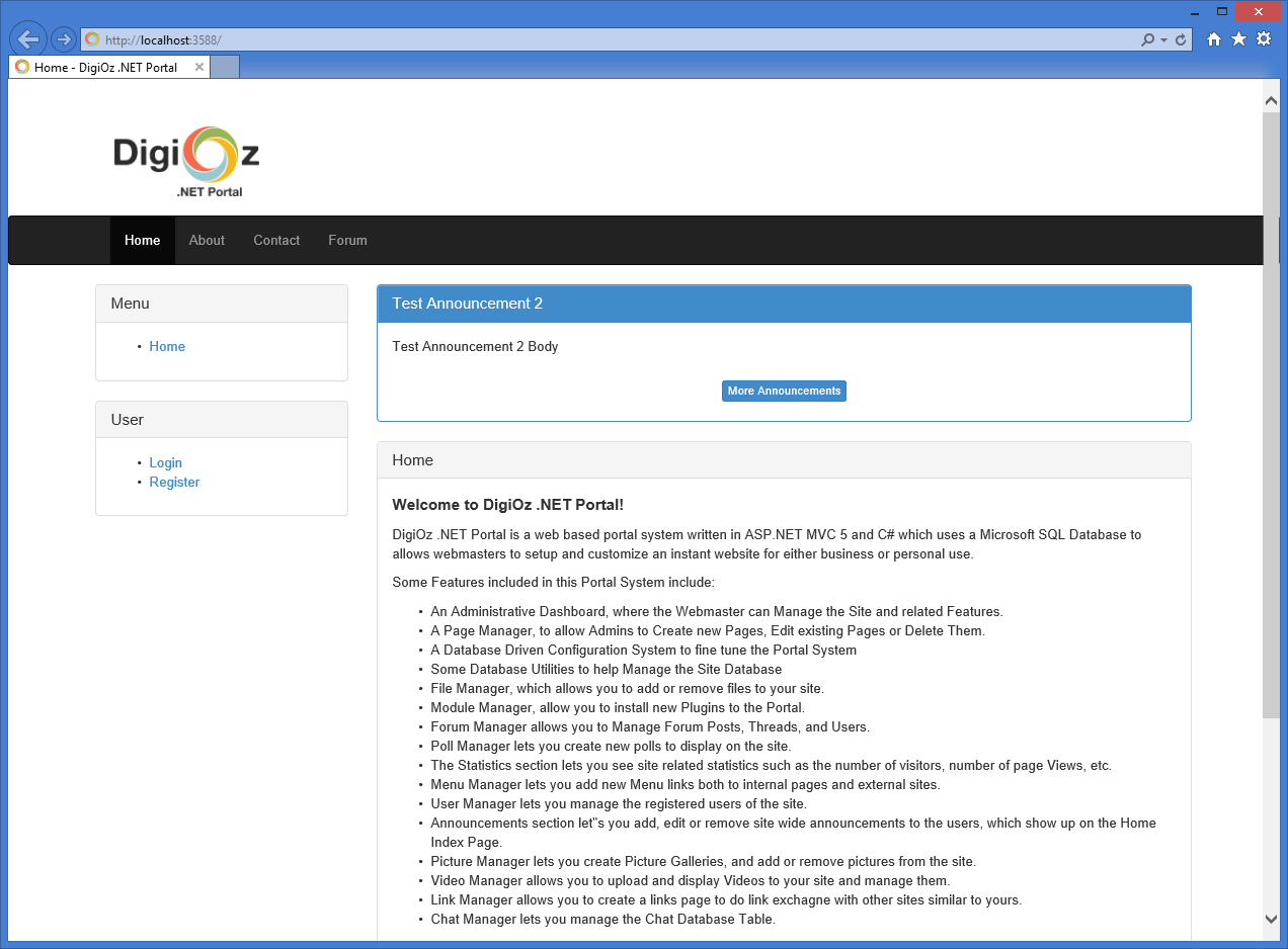 DigiOz .NET Portal is a web based portal and Content Management System written in ASP.NET Razor Pages Core 9.0 and C# using Microsoft SQL Server as a database which allows webmasters to setup and customize an instant website for either business or personal use. Because of its MVC design pattern, it allows webmasters to easily further extend the system to fit their individual business needs.