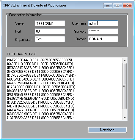 Microsoft Dynamics CRM 4.0 currently does not have a built in way for CRM Administrators to Export multiple attachments from the database and store it on a local directory on the Server or the local PC. This windows application allows you to directly connect to Microsoft Dynamics CRM by providing an Active Directory Login and Downloading Multiple Note Attachments from the Annotation Entity of CRM.